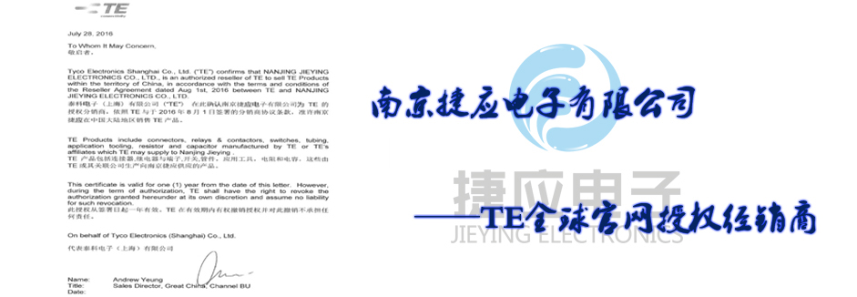 南京捷應(yīng)電子有限公司是國際無源器件品牌美國泰科電子(TE)在中國華東地區(qū)的主要通路商,代理經(jīng)銷旗下全系列產(chǎn)品包括TYCO(AMP)系列連接器、接插件、OEG、SCHRACK、P&B功率繼電器、美國RACHEM各類航空導線、熱縮套管、模縮套、標識產(chǎn)品、電線電纜。
